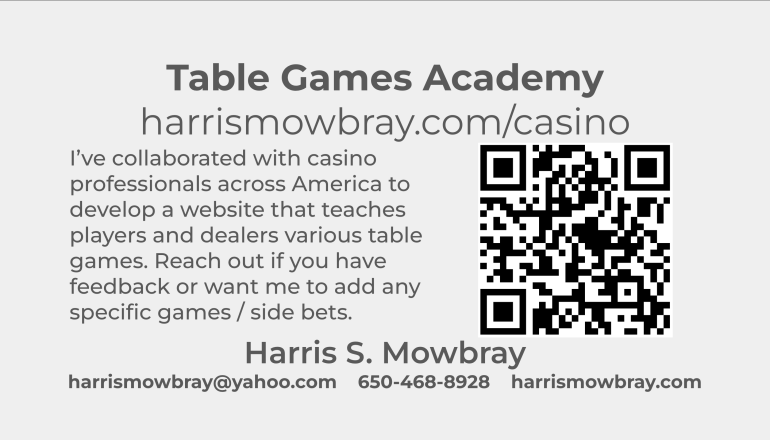 Anyways, lots of dealers wanted to check out my website and some pitbosses were interested, but unfortunately when they asked for a business card with my website on it, I did not have one (I was advised that business cards are old-fashioned). I would like to help as many dealers as I can, but I am worried that I will get in trouble for giving them my business card. I assume that casinos want minimal communication between workers and customers at casinos for fear of collusion, and I am not trying to get banned from anywhere in Atlantic City when I go next time. But what do you think, would it be appropriate to give a card with a link to my dealer training website to casino dealers? Or only to pitbosses? Or neither?