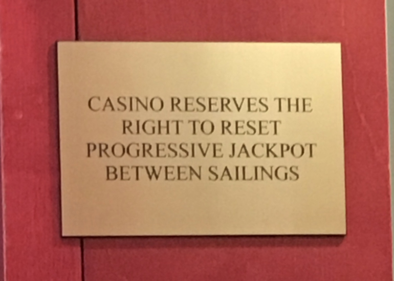 Clearing the progressives does not invalidate the above statement. The equipment still meets the standards, it is the operation of the equipment that is being handled differently. As the operator of the equipment, the policy makes sense as it adds extra revenue and the players that contributed that money are no longer on the ship so it is not negatively impacting the players that contributed the money.