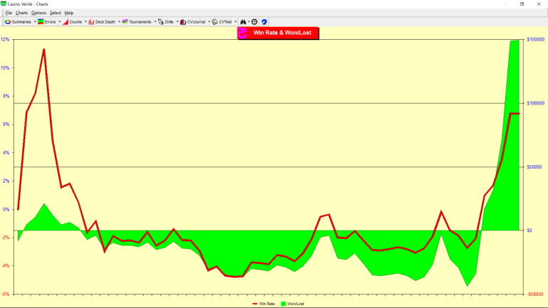 If I use the EV math, 15,000 hands X $1000 ave bet = $15 million bet X 0.005 = $75,000 or 75 bets down. Splits, DD's and BJ's are making up for so much.