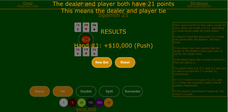 I fixed the typo, removed the 10-cards, made the game automatically end at 21, the word Ante was removed, and the only issue now is that the "result" text is too verbose which I will deal with in coming days. I apologize in advance but I think I'll actually make the text a little more detailed for Spanish 21 to help dealers learn all the niche rules. Maybe in the future I can include a "settings" section which will let people skip the results page if they want.