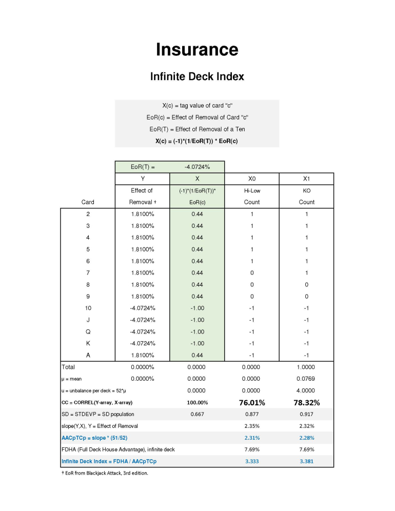 At any rate, attached is the calculation of the Infinite Deck insurance index for HL and KO. As the number or decks decrease the index decreases, For example, for two decks the HL index for insurance is around 2.5