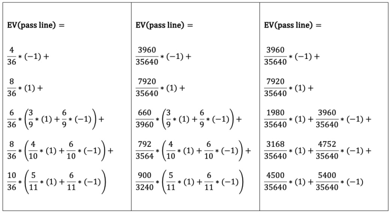 In the left column, the descriptive probabilities for the expected value of the Pass Line from above are replaced by the numerical probabilities as fractions.