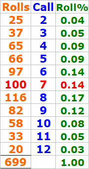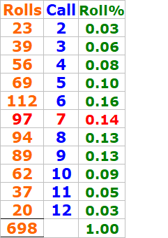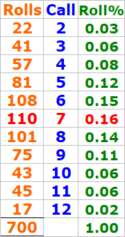 You rolled 7 a total of 97 times (13.90%) – very close to statistical norm (~16.67%).