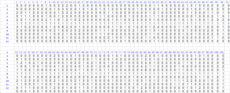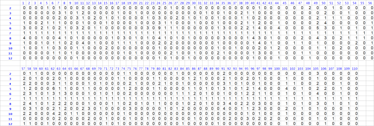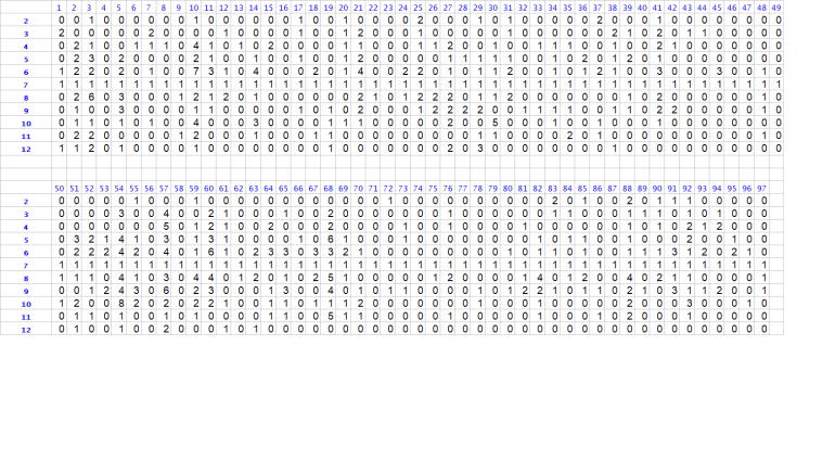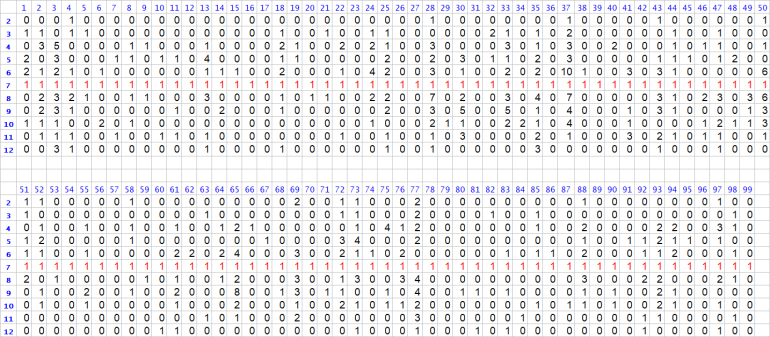 Each cell shows how many times each number was rolled before a 7 appeared.