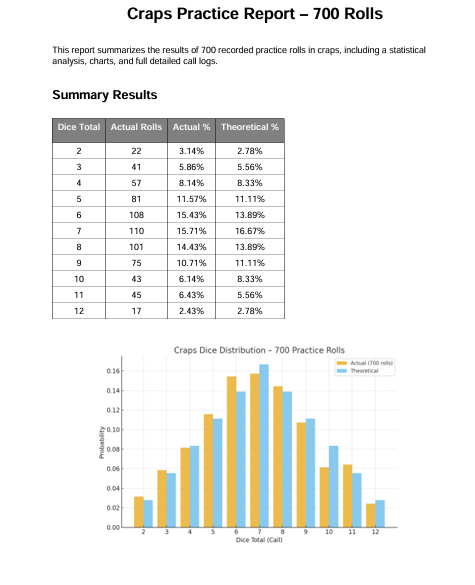 🎲 Summary Report: Practice Session of 698 Craps Rolls