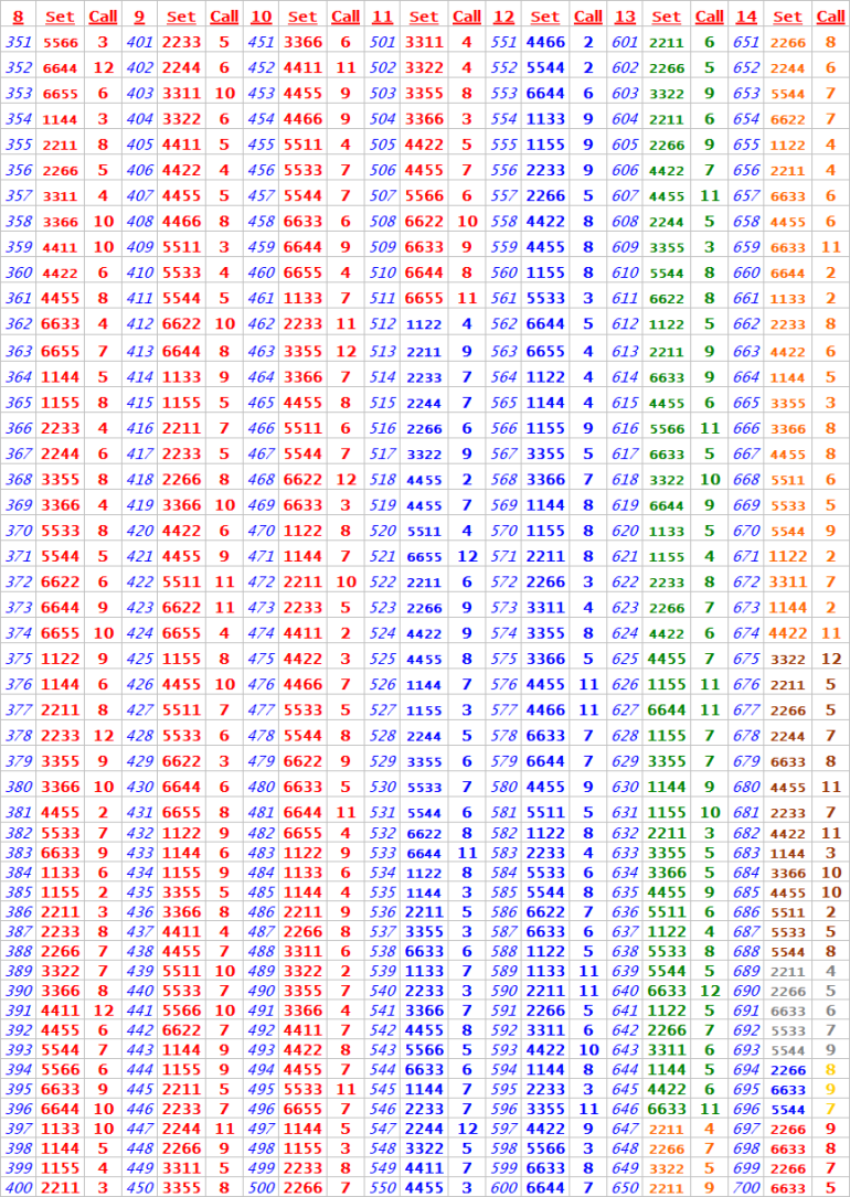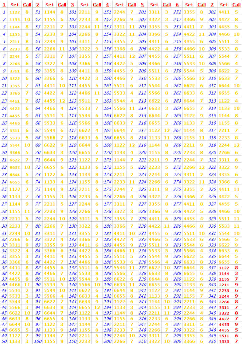 A "call" is marked by a "/" over a number, such as 2, 3, 4,5, 6,8,9,10,11,12