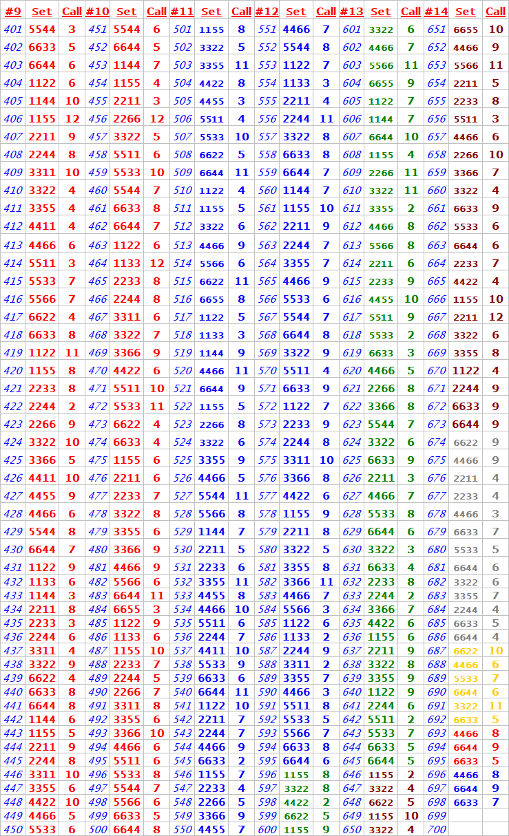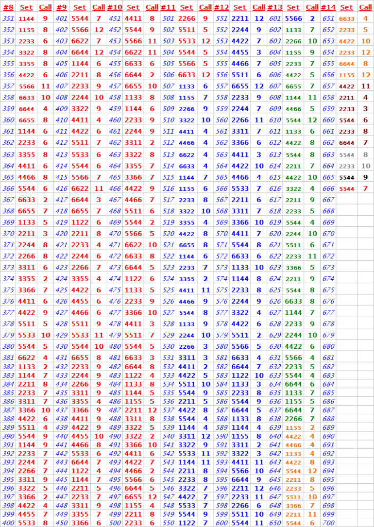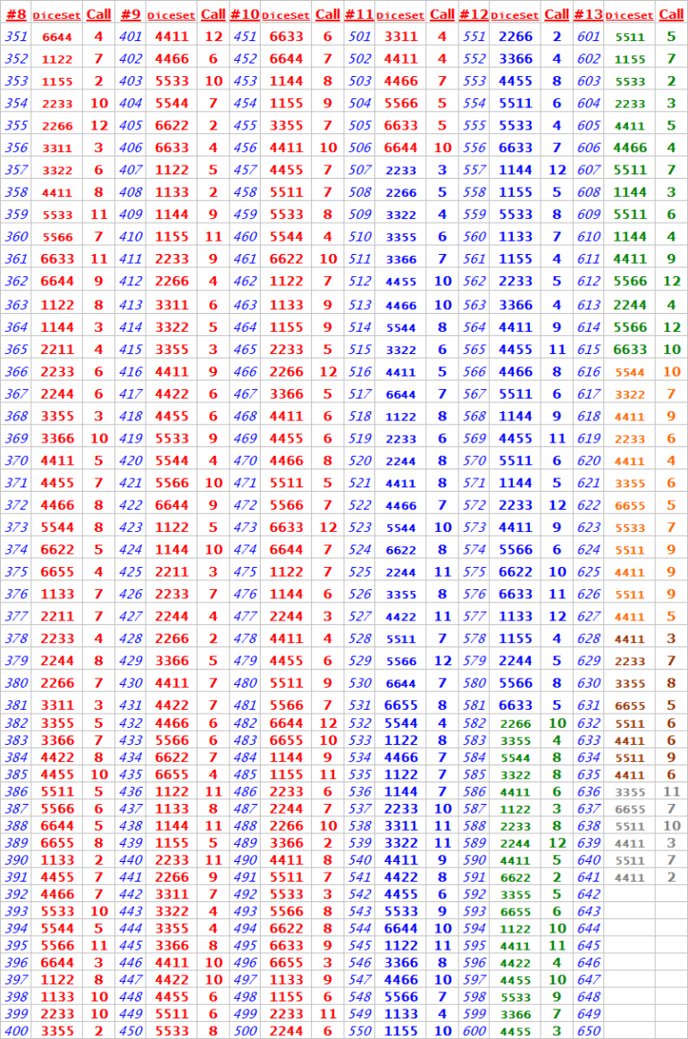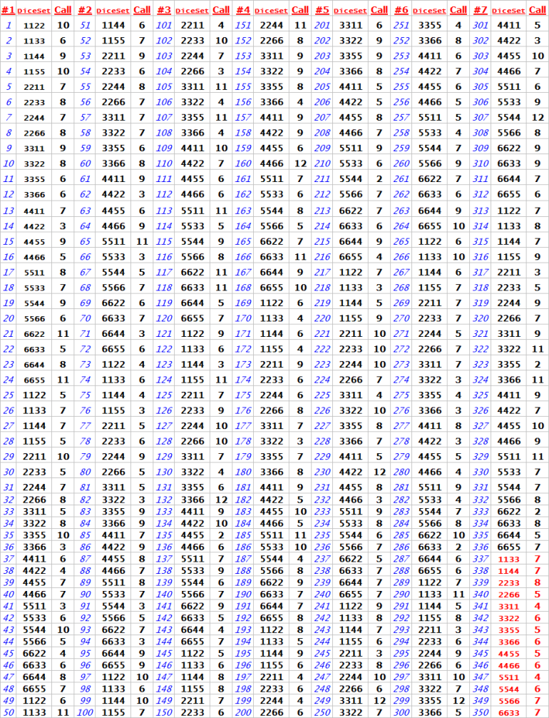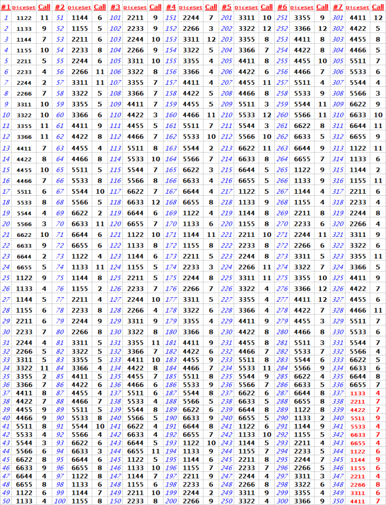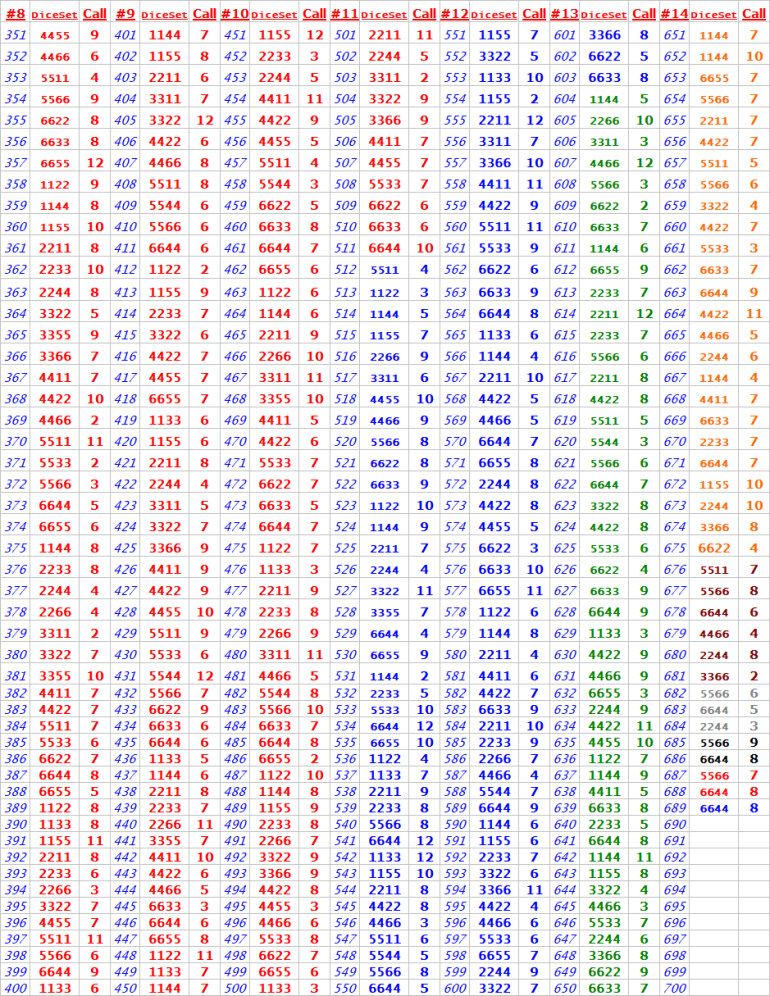 Use of different dice sets and call numbers across 14 tracked sequences.