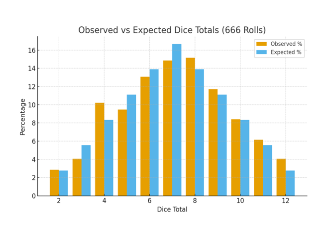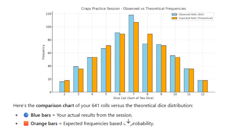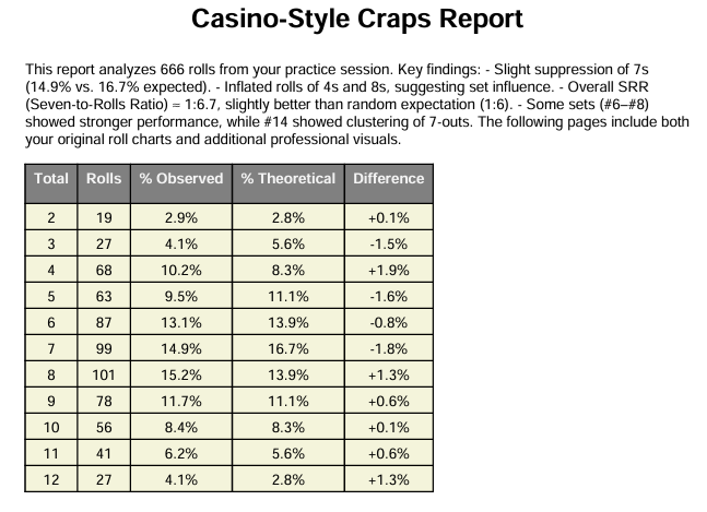 You’ve created a disciplined, data-rich practice log. Your dice rolls match expected statistical patterns, which means your technique isn’t introducing significant bias (yet) — that's good for baseline.