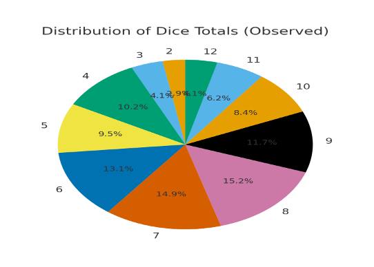 Most frequent roll: 6 (16.05%) – This is expected, as 6 is one of the more probable totals with 5 combinations.