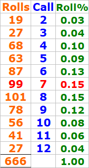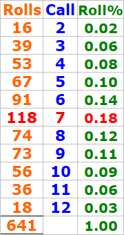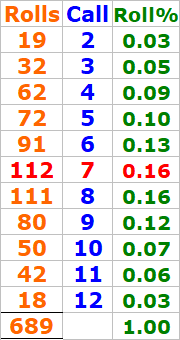 Common gaps: Higher frequency of rolls showing 0 hits on 2, 3, 11, and 12. These are harder to hit due to fewer combinations (only 1 or 2).