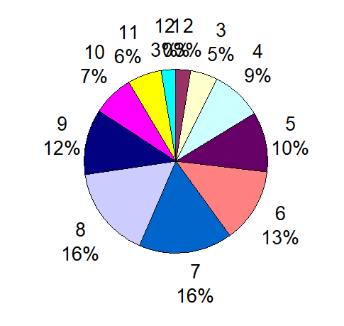 Next most common: 7 (13.90%) and 8 (13.47%) – Also consistent with the probability curve.