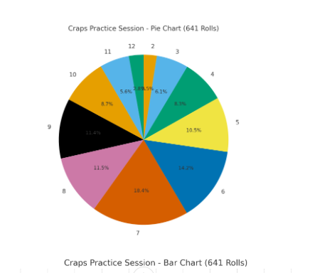 "Thanks for sharing your practice session data for the Craps "Make 'Em All" bonus and the detailed dice roll results. Based on the 4 charts you’ve provided, here’s a structured analysis and summary write-up of your 698-roll practice session.