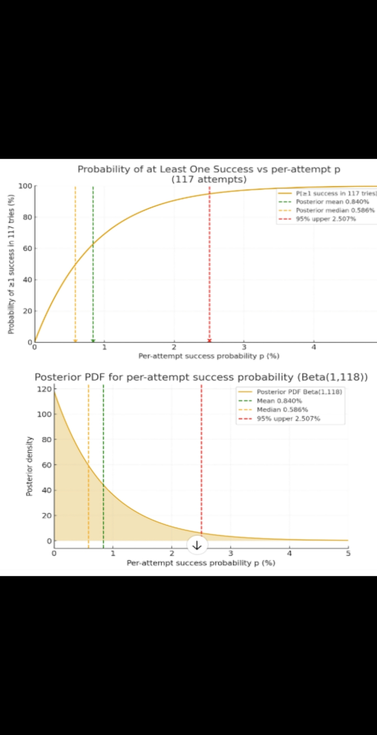 700 rolls is about half of that, so hitting it in 700 rolls is about half as likely.