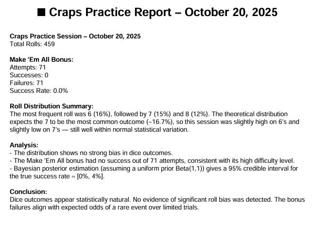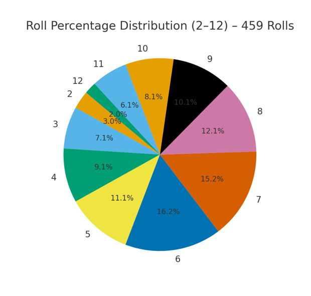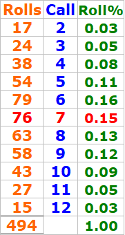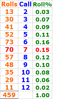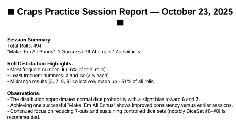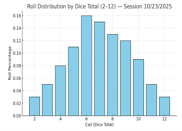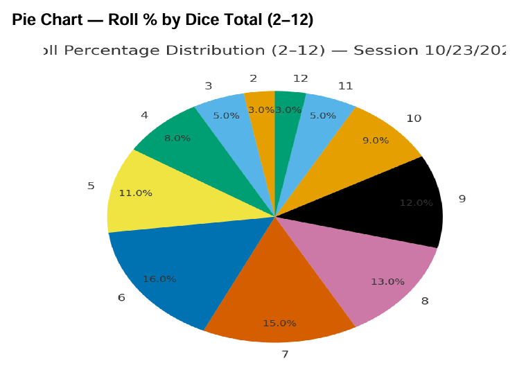 My current data (as of the 10/23/2025 craps report) shows those numbers make up about 51% of all rolls, and I’m aiming to push that closer to 54%.