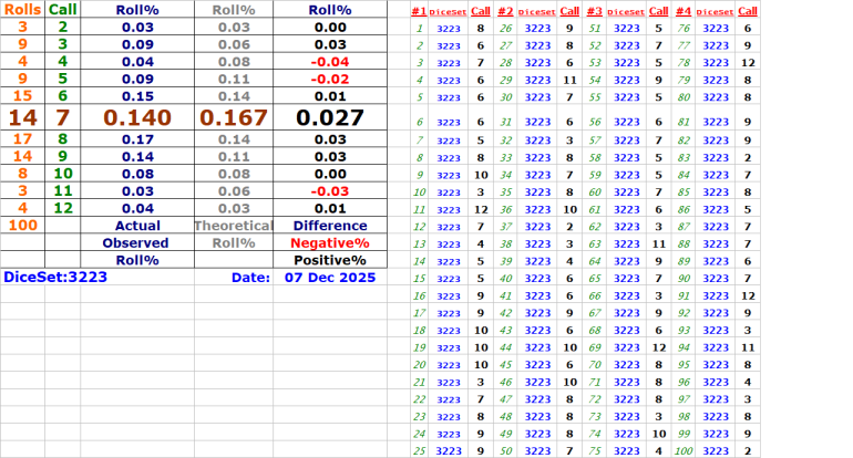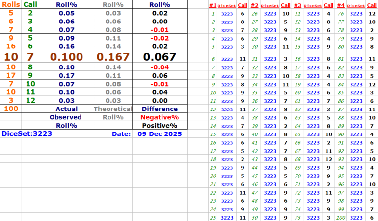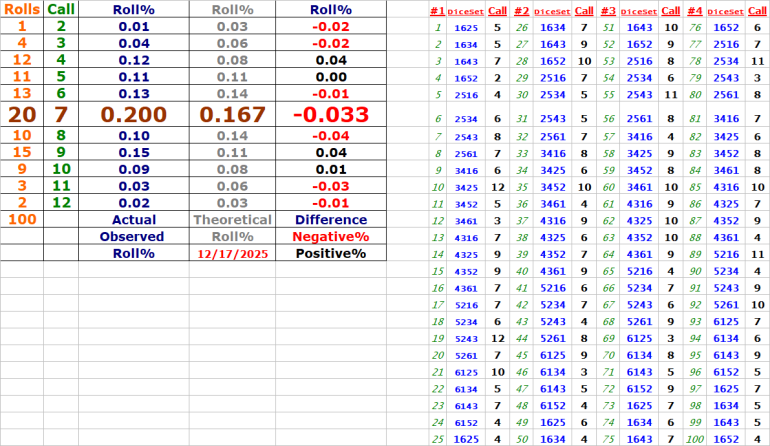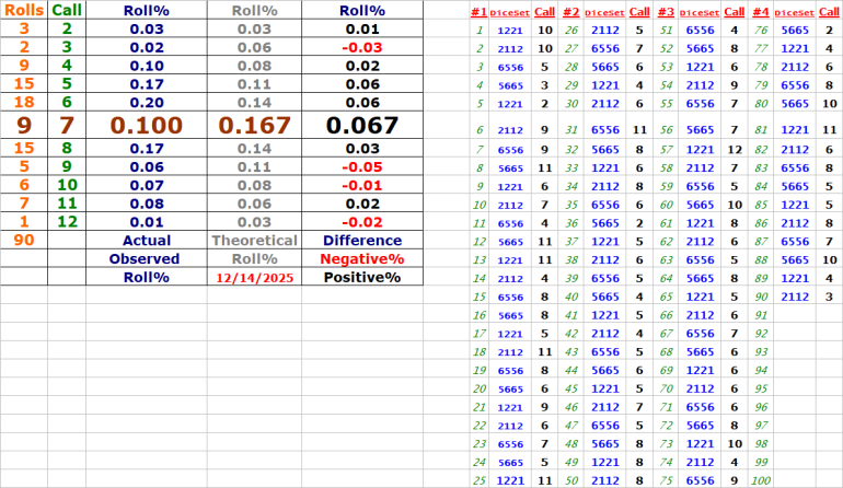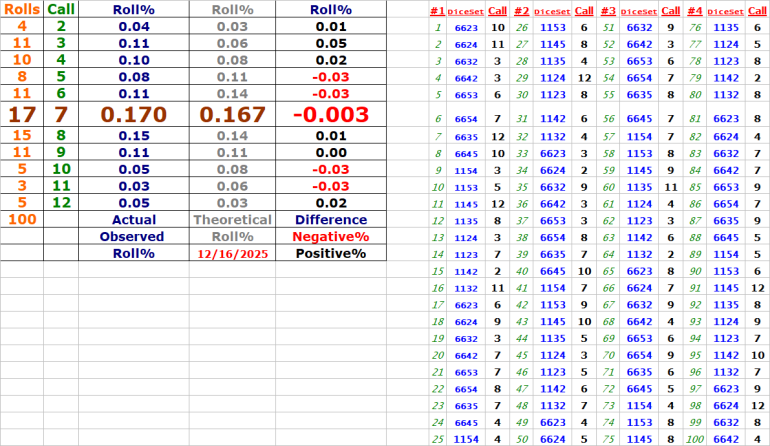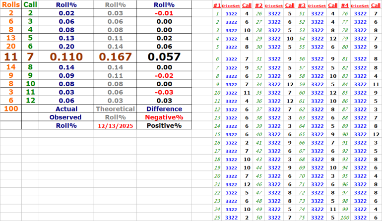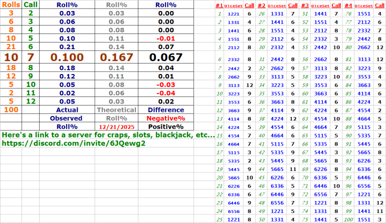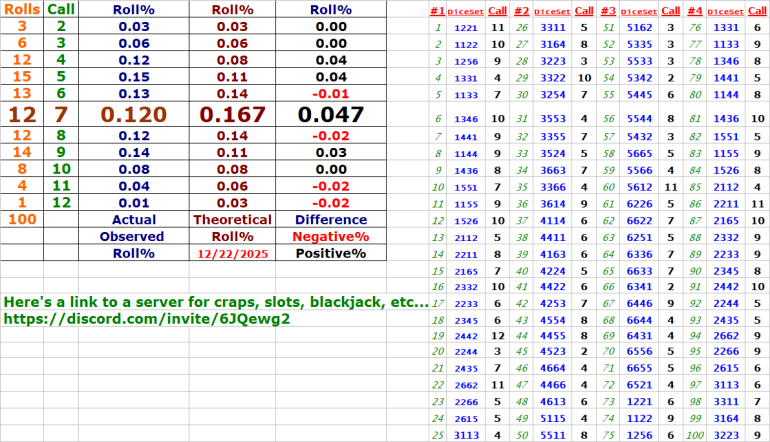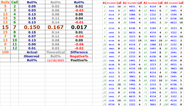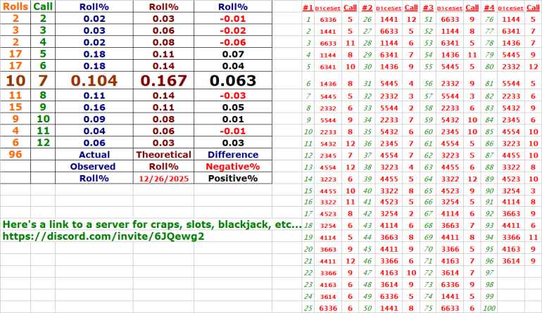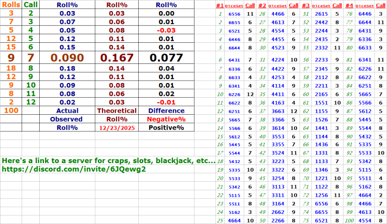 My current data (as of the 10/23/2025 craps report) shows those numbers make up about 51% of all rolls, and I’m aiming to push that closer to 54%.