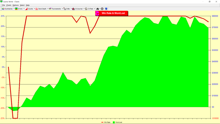 Here's my latest win of $70K over 90 hands at +22% RTP with an average bet of near $3.5K and a total bet of $313K. Notice I'm pegging this chart at both -25% and +25%. One shoe is just over 60 hands.