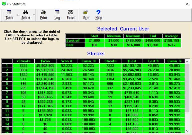 One thing I find appalling is that the Dealer has more winning streaks than the Player does after 2 in a row. I use my progressions most of the time so I'm making up for lost ground using those. But maybe the game is punishing me for using them in it's algo. So I won 30,567 hands and lost 34,528 hands for a total loss of 3,961 hands. That totals to 65,095 hands. 30,567/65,095 = 46.957% of hands won, so it must be discounting about 6K pushes.
