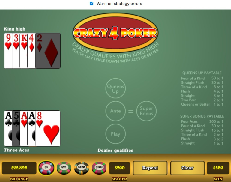 With a Queen's Up Bet of $50 and Ante & Super Bonus bet of $30 each and a triple raise to $90 for Play on a pair of Aces or above, I'm winning $580 (plus the bet back) on a $200 bet for trips that win.