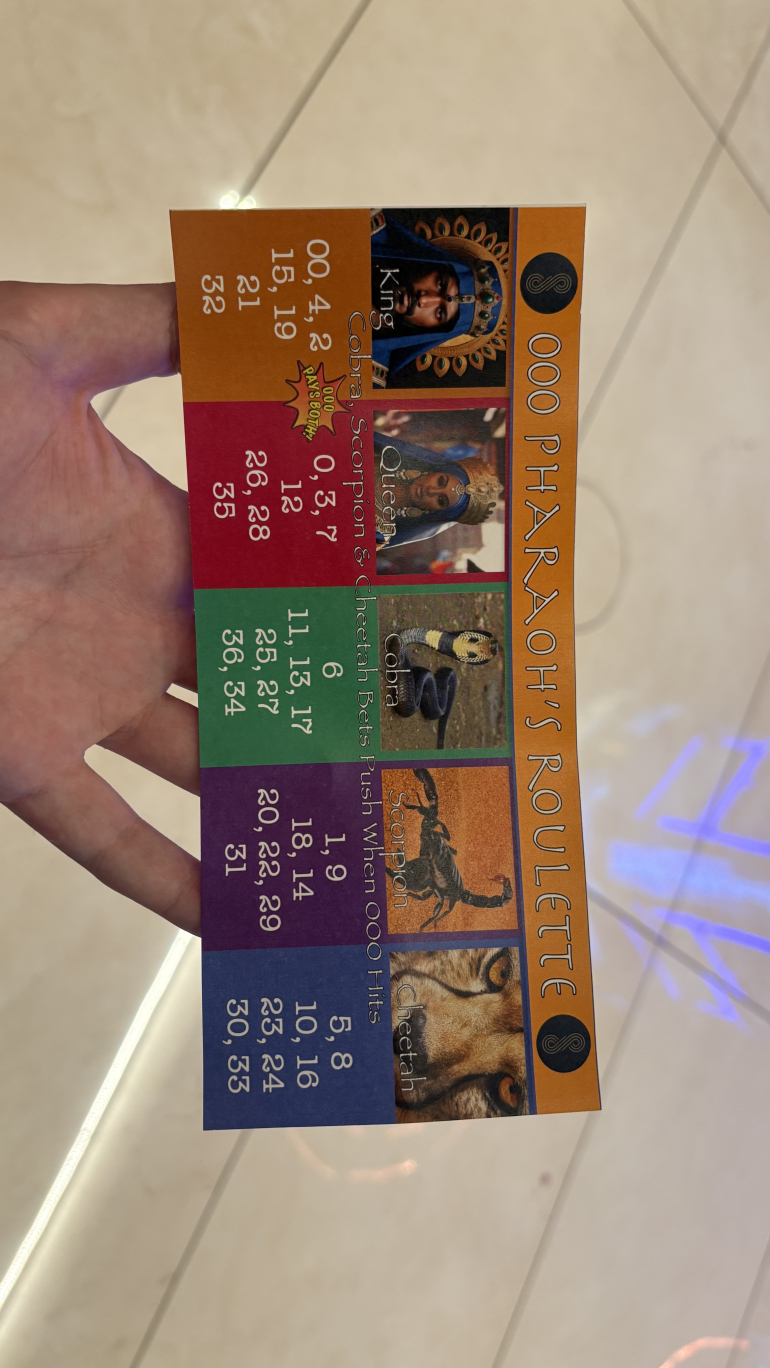 However, in double zero roulette, the 0 is a push for Scorpion, Cobra, and Cheetah; they didn’t have a pamphlet for double zero and wouldn’t let me photograph the wheel or table so you’ll just have to believe me.