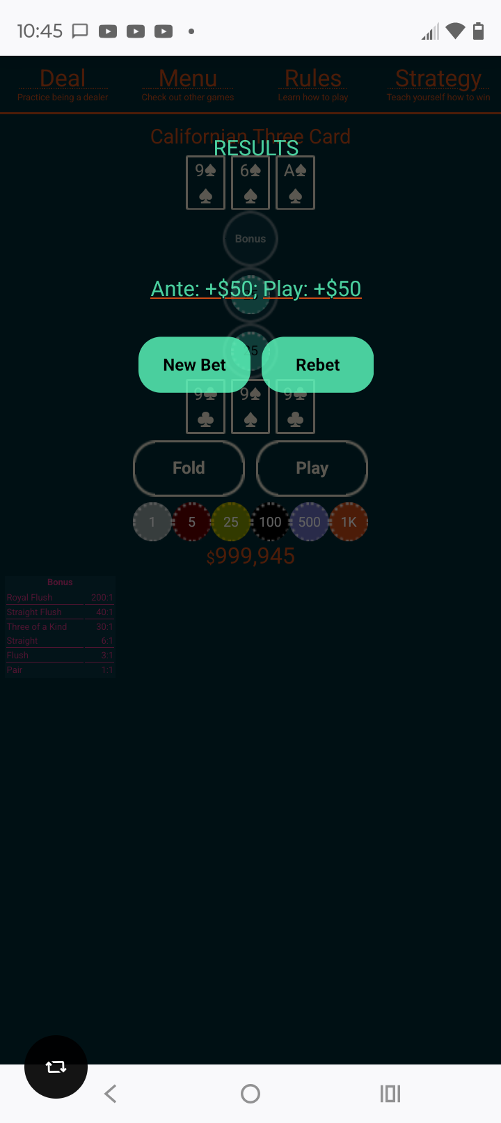 how many decks are you using in your simulation? I played $25 ante and got 2 nine of clubs and a nine of spadesQuote: harrisWhile I haven't played it, I've read about a three card poker variant from California in which you get to see one of the Dealer's cards.