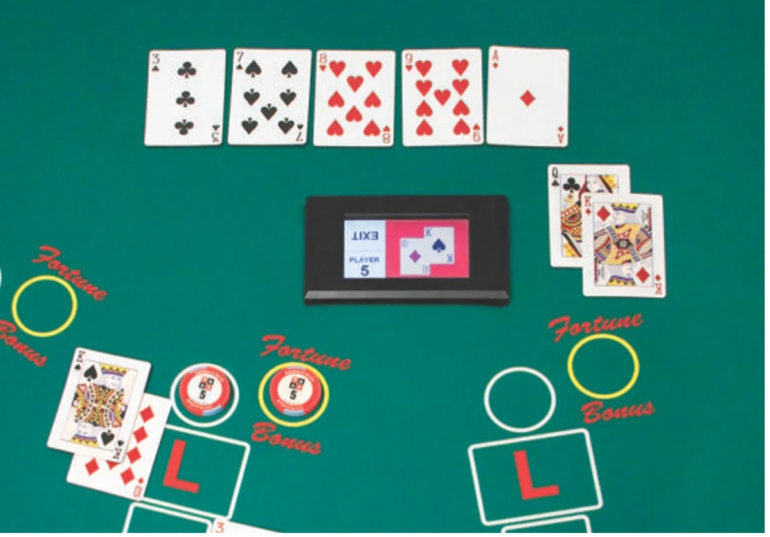 This product is from Shufflemaster. Their PGP table uses SHFL's "i-deal" card shuffler, which reads all the cards as they are dealt. This picture shows the "i-verify" screen, which indicates the house-way Low hand: in the case shown, for Player 5, the house-way Low hand is Ks, 10d.