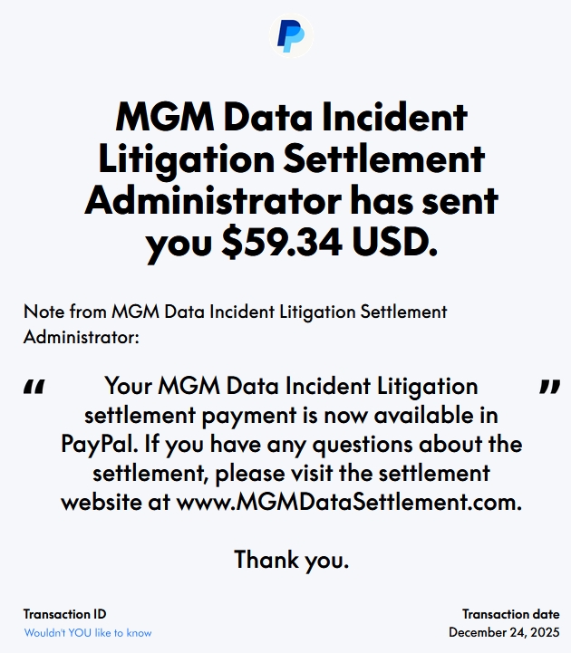 Did anyone else get an email from, or at least claiming to be from, a settlement involving a data breach from MGM?