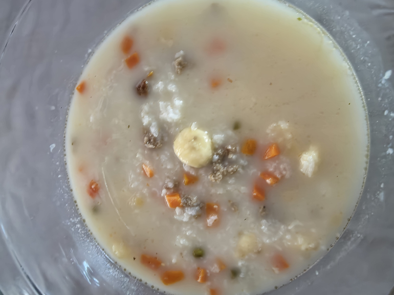 Use a large bowl! Congee foams and can overflow easily.