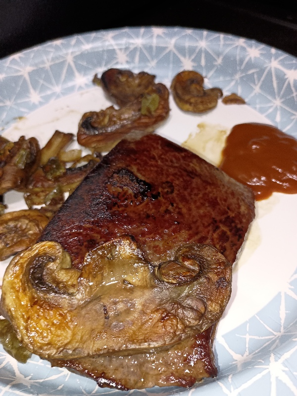 Some delightfully large mushrooms fried in giardiniera and a flatiron steak.