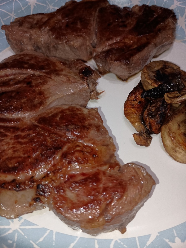 A pair of chuckeyes and mushrooms. I fried the mushrooms in the remnant beef fat after the steaks came off the pan, which seemed to impart a rich, slightly smoky flavor.