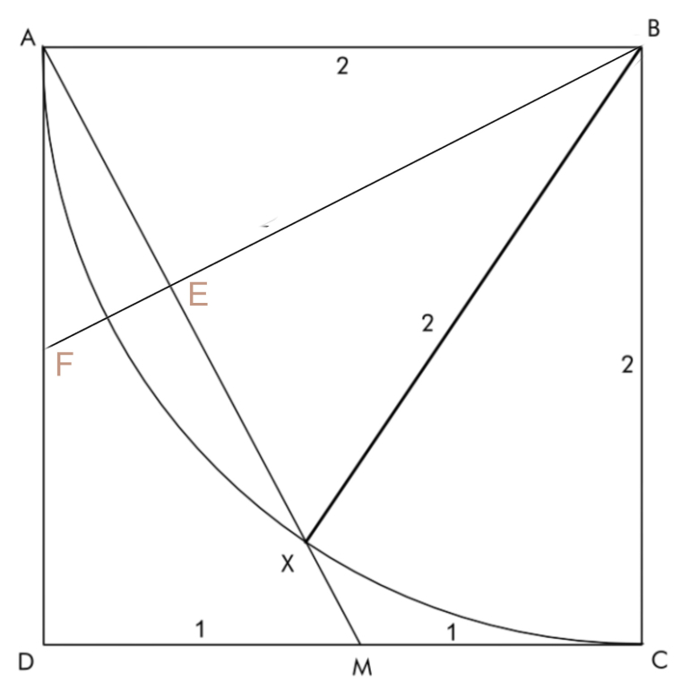 As AM=SQRT(5), AD=2, DM=1 means AE=2/(SQRT(5) = 2/5 * SQRT(5) (and EX is the same).