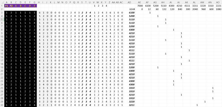 ^ I've now developed a spreadsheet which essentially creates every combination of how the suits are given to the various ranks.