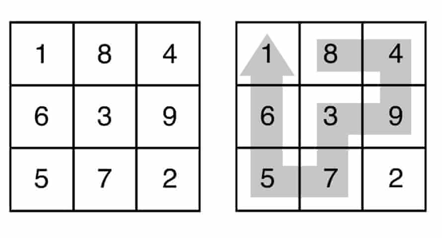 With your finances in ruins you have no choice but to don a green track suit and enter this year's Squid Game tournament. In the first challenge, all the players are brought to the main courtyard which is full of 3x3 grids filled with numbers. Players are divided into small groups and each group gathers around a grid. You are told that each player must walk through the 3x3 grid (below left), moving either horizontally or vertically from cell to cell, and not entering any cell more than once.