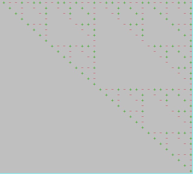 Here, the plus and minuses tell you whether to add or subtract an array element from the total number of legal draws. So, if you draw to a four card RF, you start with 48 total draws, including the one when the discard comes back into the hand. Then, using the triangle, you subtract off the one hand that contains the RF. This gets you to the correct answer, 47.